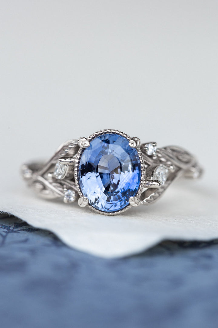 READY TO SHIP: Patricia ring in 14K white gold, natural blue sapphire 8x6 mm, accent natural diamonds, AVAILABLE RING SIZES: 5.25 - 8.25 US