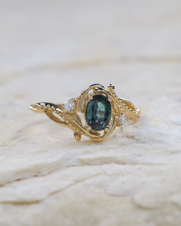 READY TO SHIP: Undina ring in 14K yellow gold, natural teal sapphire oval cut 7x5 mm, natural diamonds, AVAILABLE RING SIZES: 5.5 - 8.5 US
