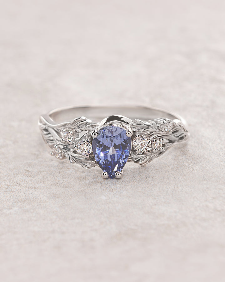 Delicately sculpted, this leaves band would be perfect for alternative engagement ring seekers. You can see Japanese maple leaves wrapping the central gemstone - lab-created light blue sapphire.
