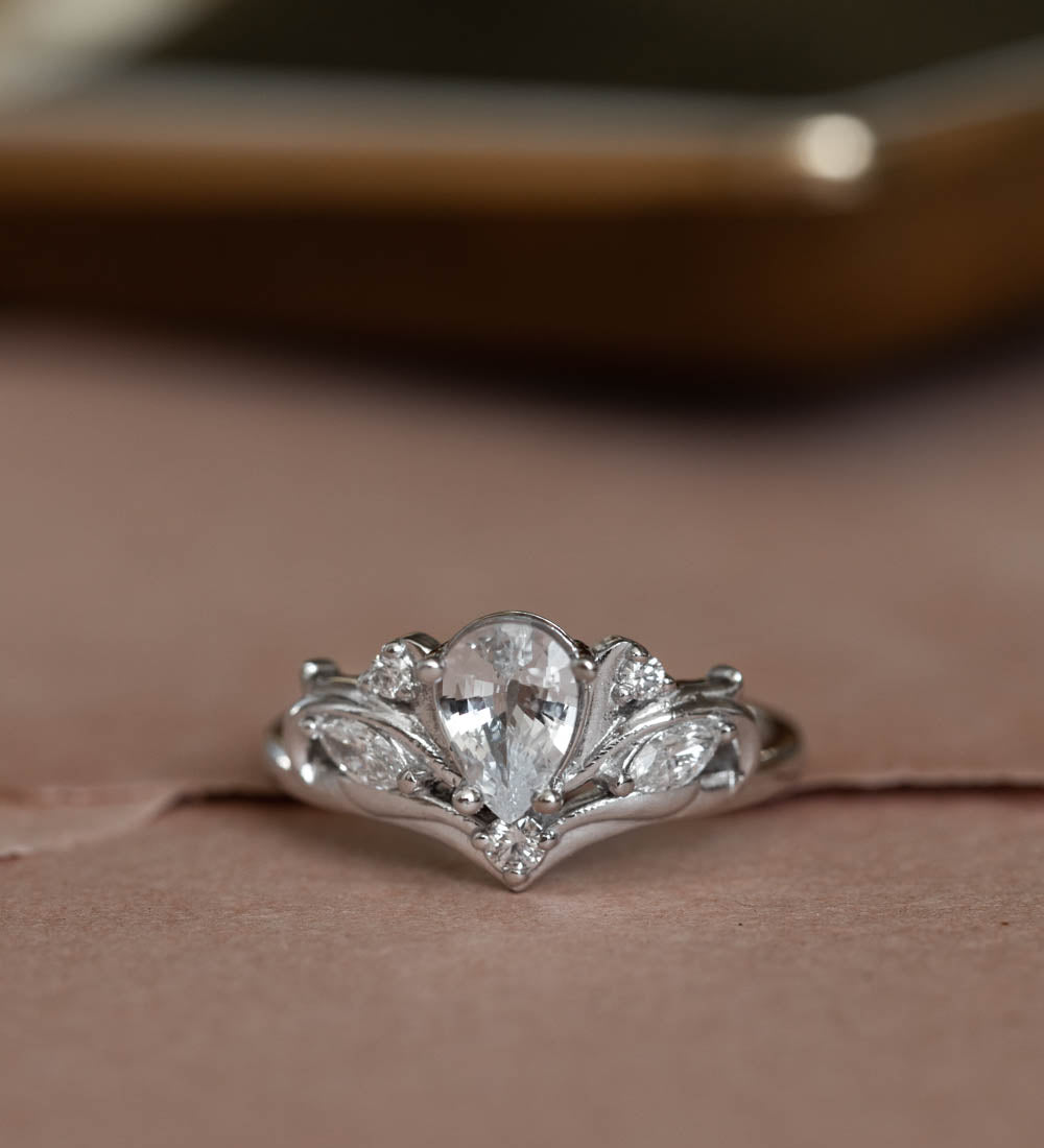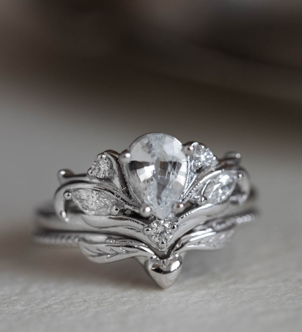 Let the smooth, flowing lines and glowing gemstone of Swanlake reflect the honesty of your feelings and the depth of your bond. The round or pear cut central gemstone sits serenely between marquise and round cut accent stones and gold tendrils that ripple like water. Choose from three matching wedding bands for a lovely, meaningful bridal set.
