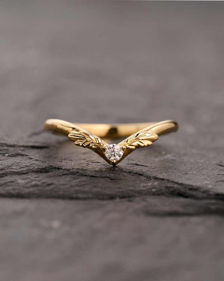 Curved oak leaves wedding band, v shape wedding ring with diamond