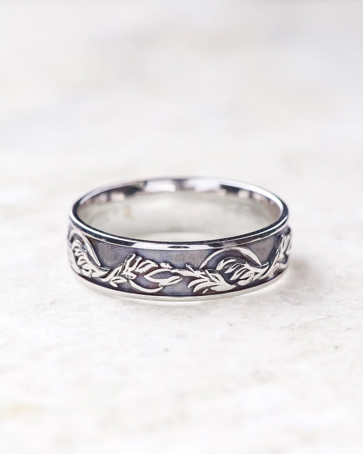 White gold leaf wedding ring for man, japanese maple leaves ring with black rhodium plating