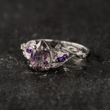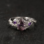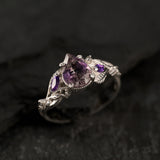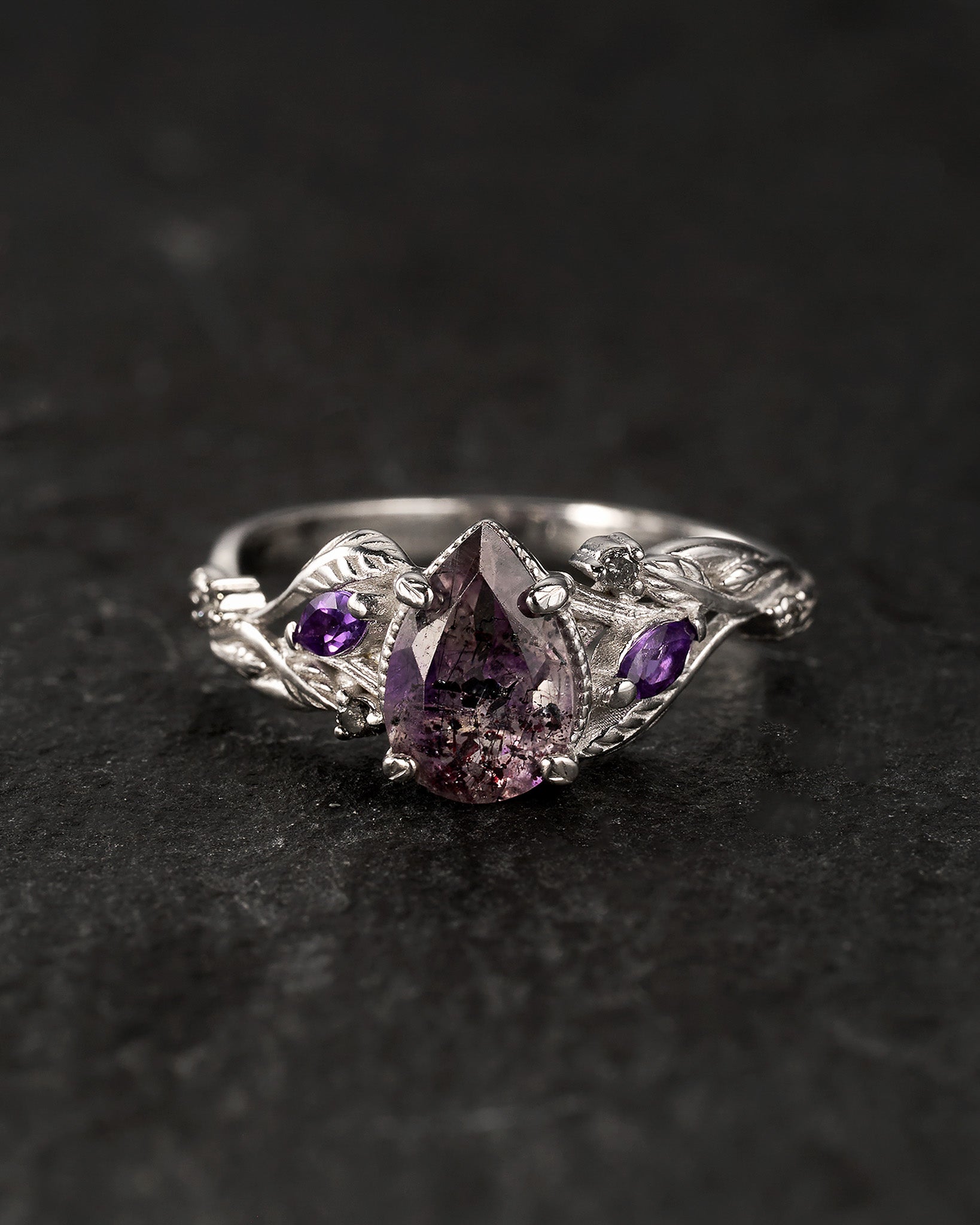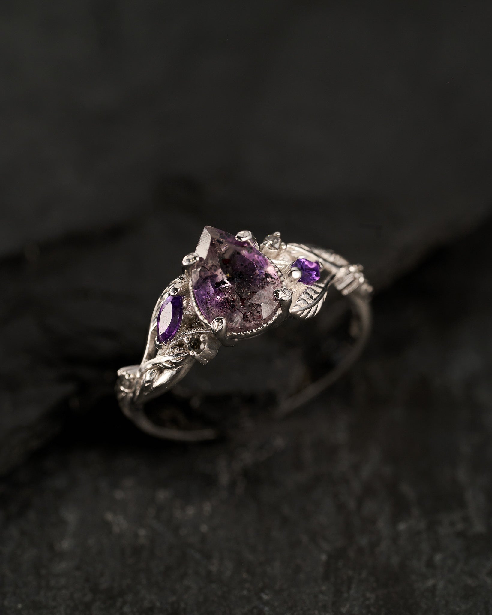 Patricia ring shows an intricate design with vines and leaves interlacing in a natural way. Side gemstones are scattered between twigs - marquise cut gemstones are reminiscent of leaf shapes, and small round cuts look like shiny morning dew. The central gemstone has a beaded frame around it, which adds extra detail.