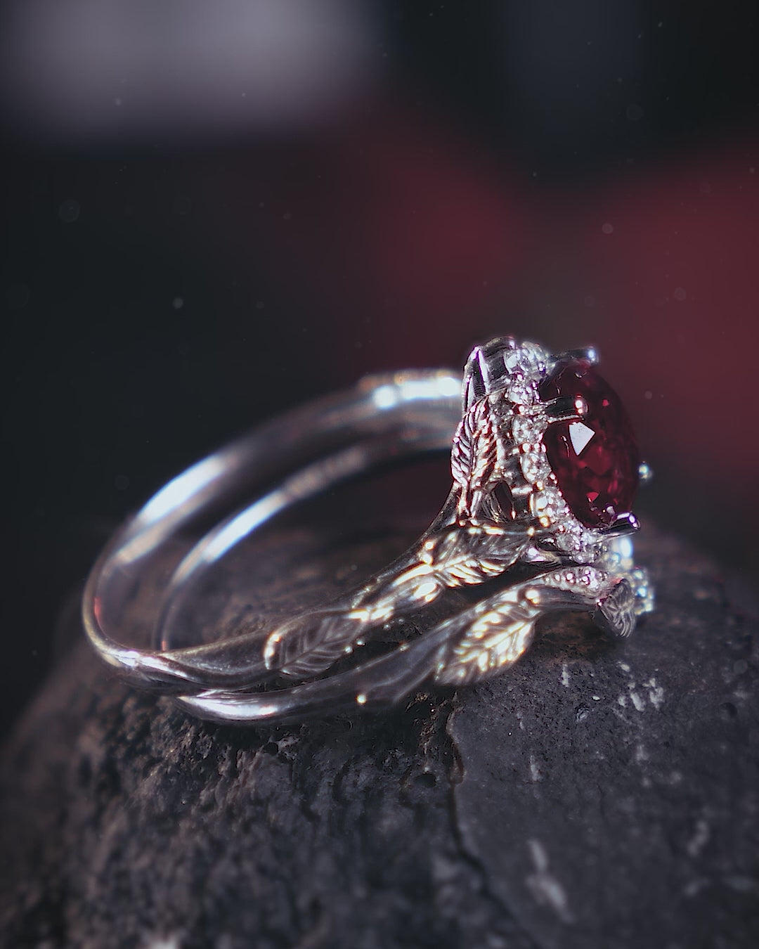 Halo engagement ring with 1.5 carat lab ruby, white gold leaf engagement ring / Florentina