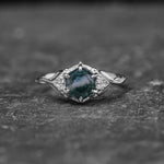 Moss agate engagement ring, gold leaves proposal ring with diamonds