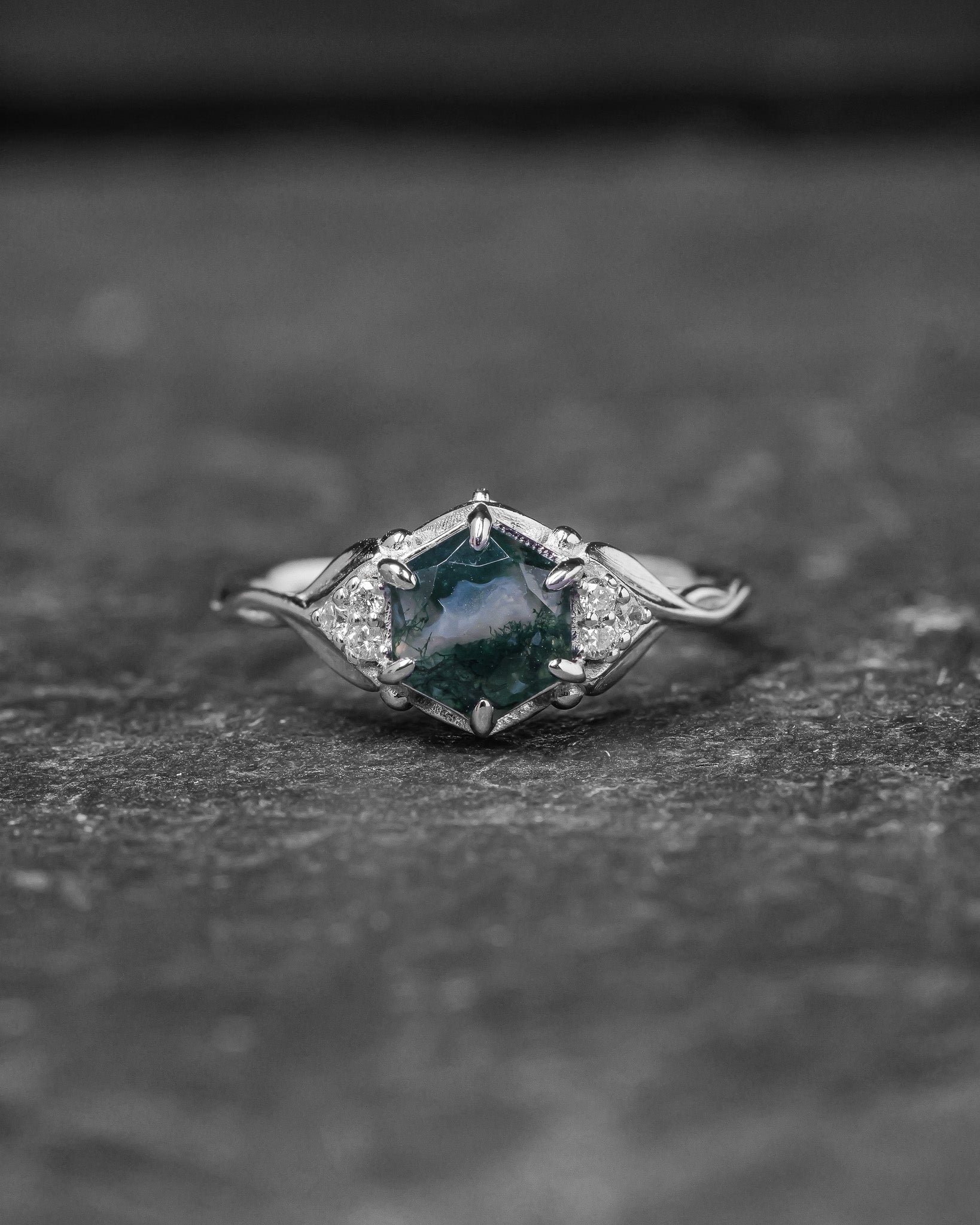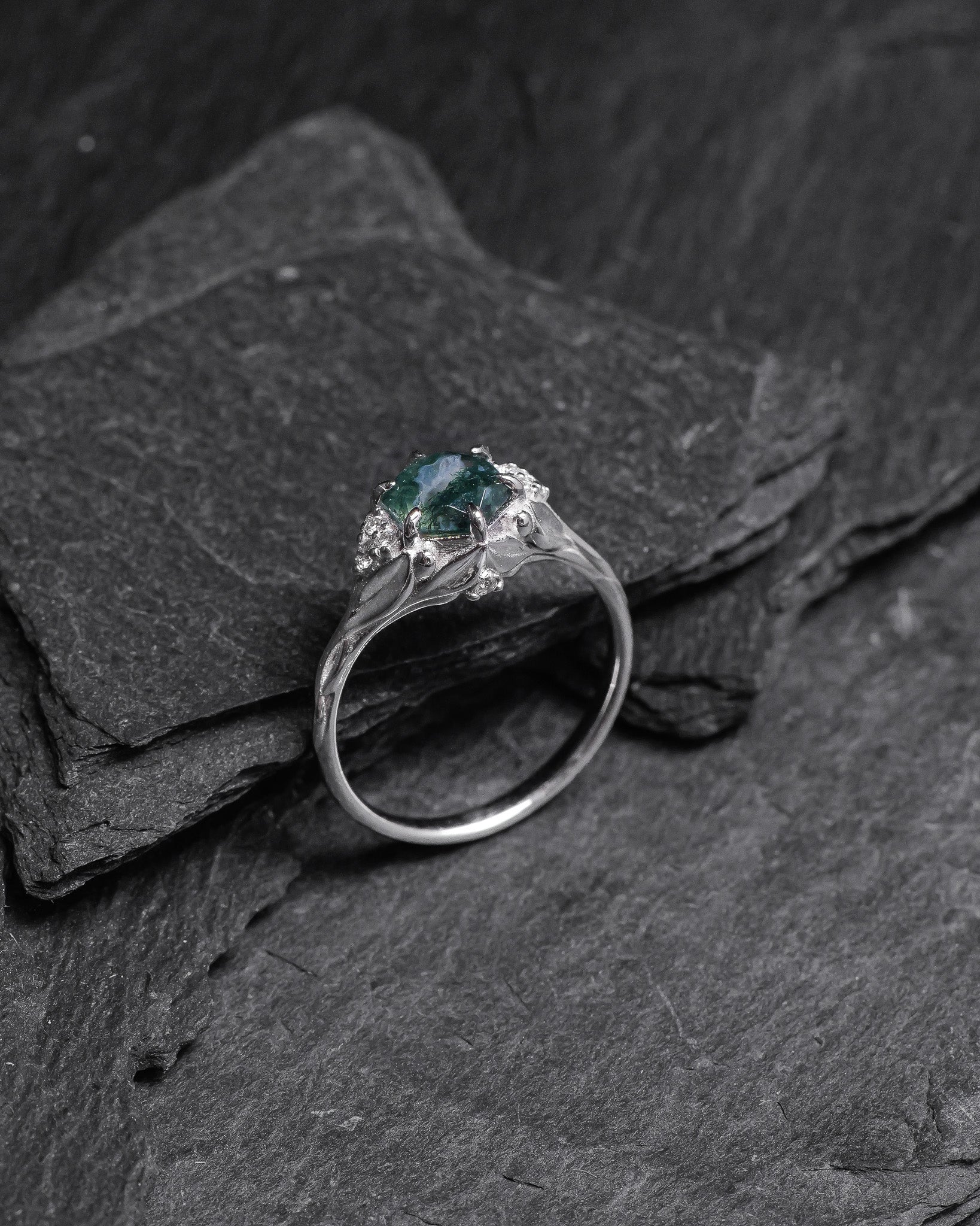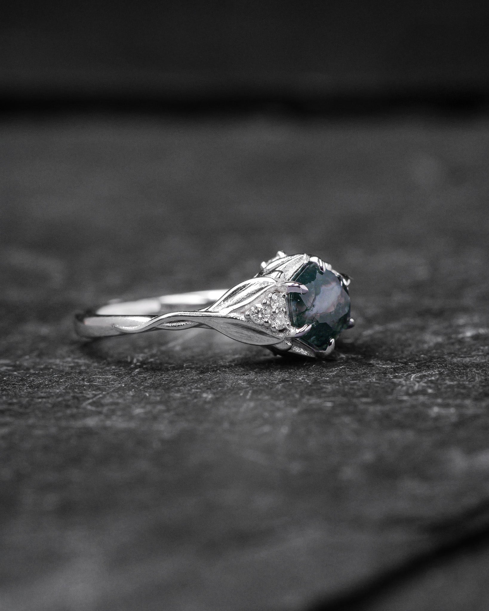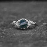 Moss agate engagement ring, gold leaves proposal ring with diamonds / Roma