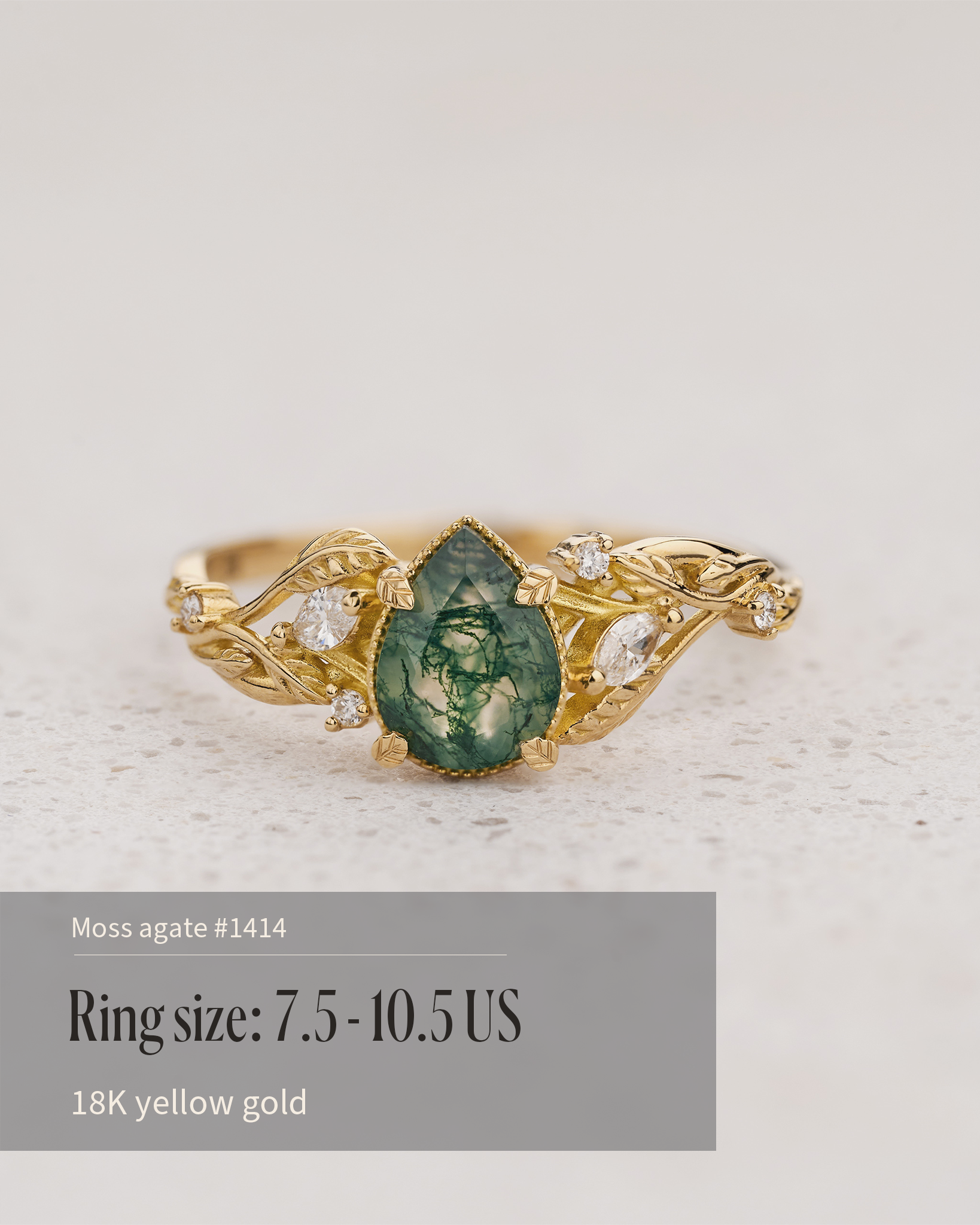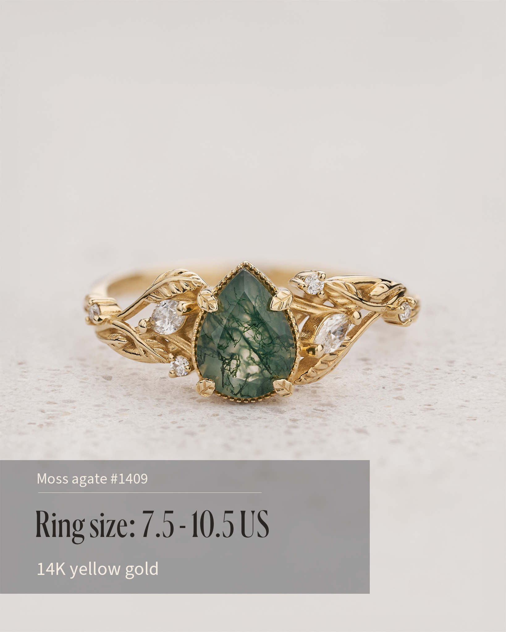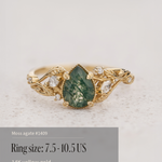 READY TO SHIP: Patricia ring in 14K or 18K yellow gold, natural moss agate pear cut 8x6 mm, accent lab grown diamonds, AVAILABLE RING SIZES: 5.5 - 10.5 US