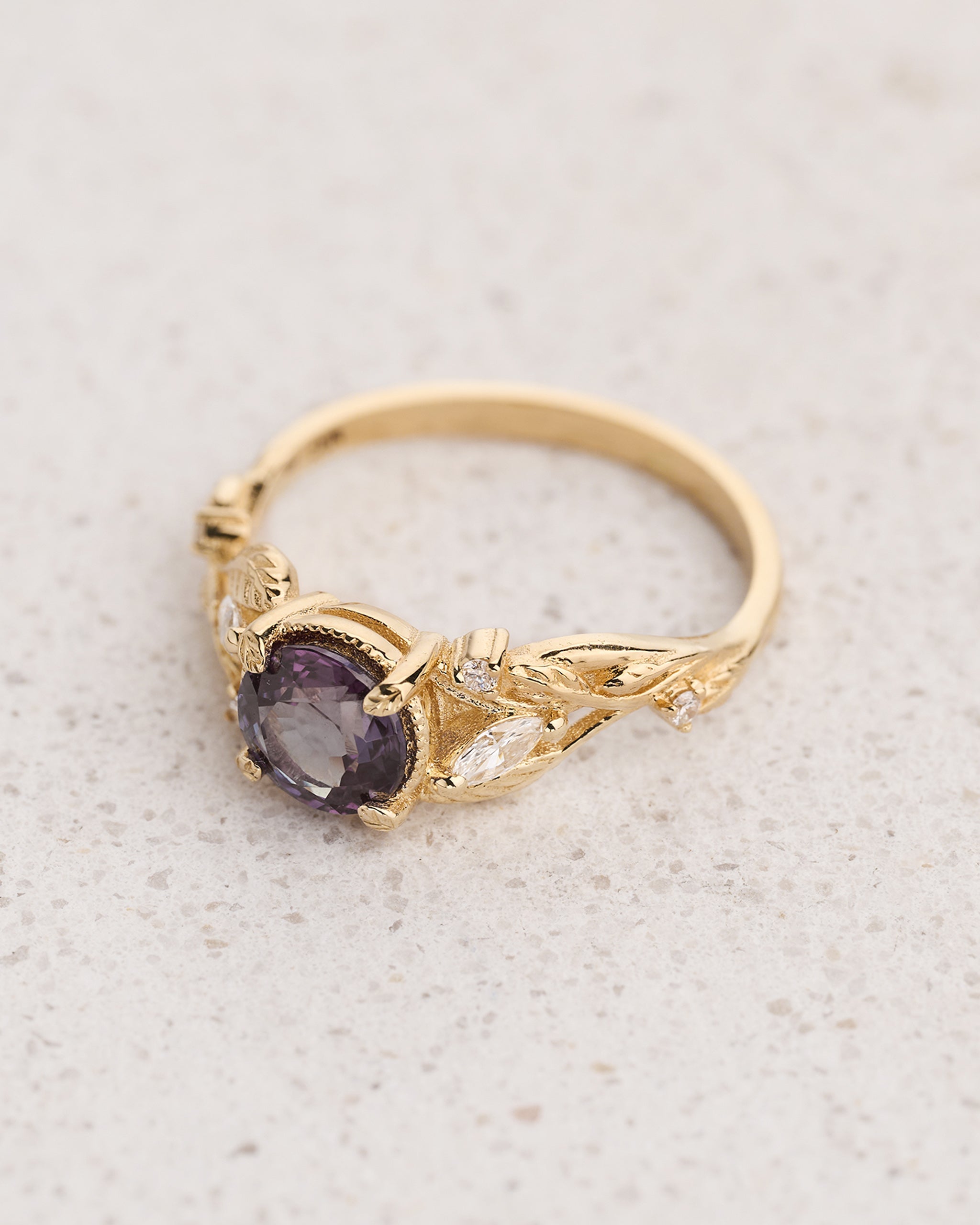 Patricia ring shows intricate design with vines and leaves interlacing in a natural way. Side gemstones are scattered between twigs - marquise-cut diamonds remind leaf shapes, and round-cut ones look like shiny morning dew. Central gemstone has a beaded frame around it, which adds extra detail.