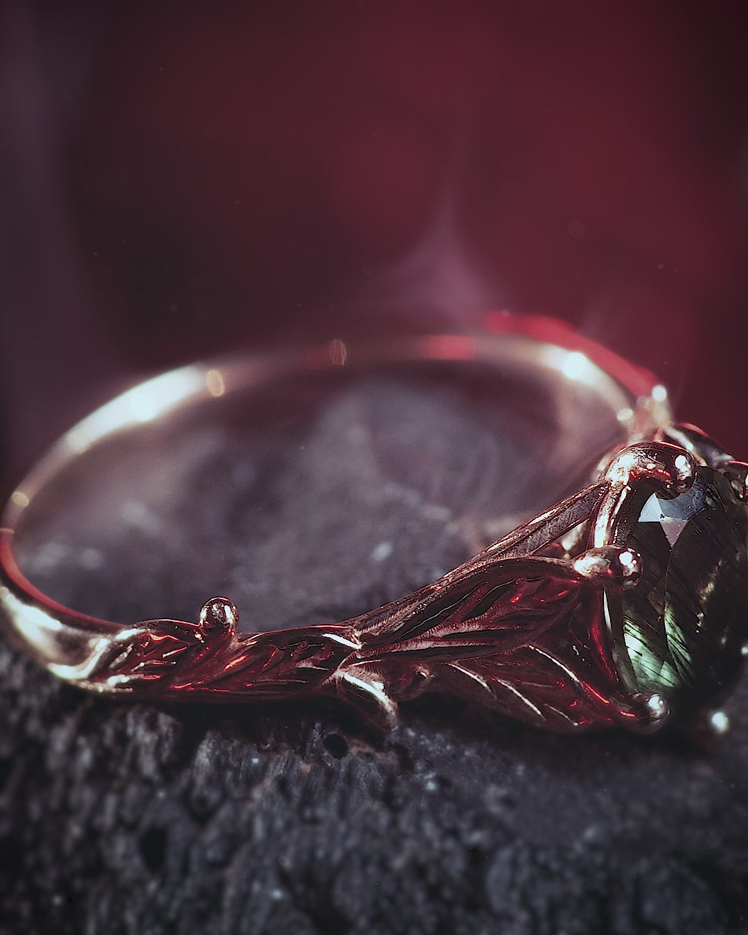 It's all about harmony and romance. Freesia ring will represent your tender feelings and serious intentions in the best way. Handcrafted from solid gold this engagement ring features detailed leaves and organic lines wrapped around the central gemstone.