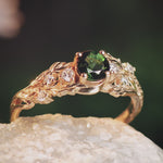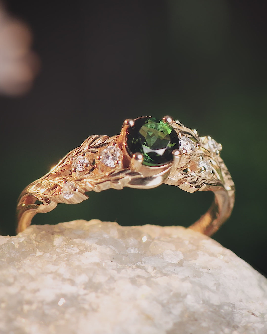 Delicately sculpted this leaves band would be perfect for alternative engagement ring seekers. You can see Japanese maple leaves wrapping the central gemstone - natural green tourmaline. Sparkling diamonds are scattered between gold leaves reminding dew in the forest.