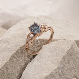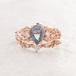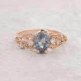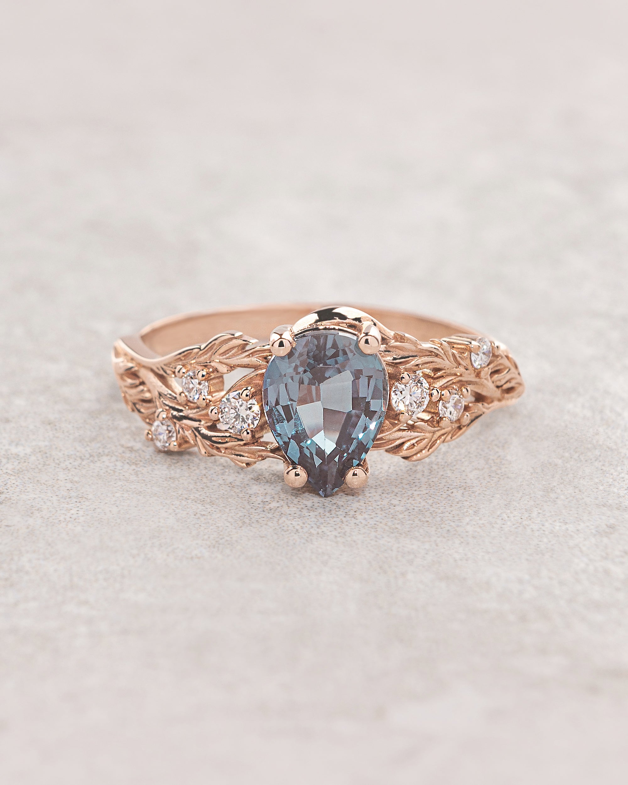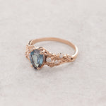 Delicately sculpted, this leaves band would be perfect for the alternative engagement ring seeker. Highly detailed Japanese maple leaves wrap around the central pear-cut gemstone. Sparkling diamonds are scattered among the gold leaves, evoking dew in the forest.