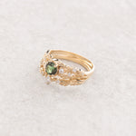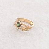 Delicately sculpted, this leaves band would be perfect for the alternative engagement ring seeker. Highly detailed Japanese maple leaves wrap around the central round-cut gemstone. Sparkling diamonds are scattered among the gold leaves, evoking dew in the forest.