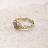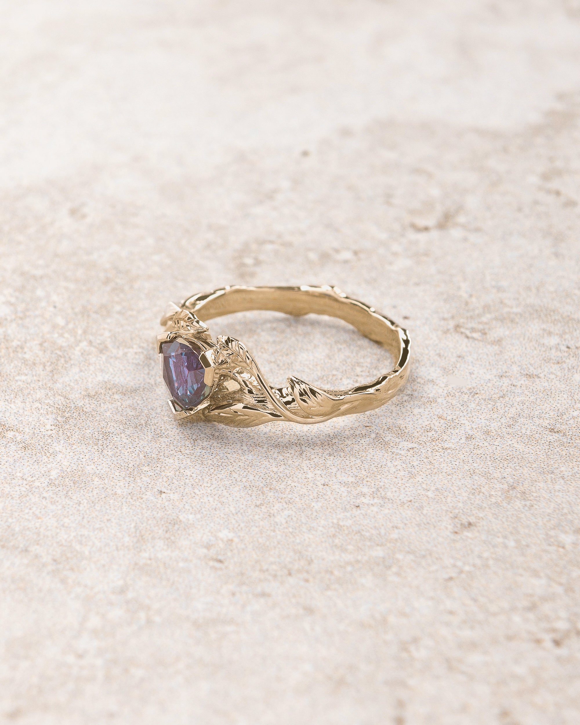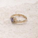 Skilfully crafted from solid gold this branch ring captivates with colour changing gemstone. Trillion cut gemstone ring shows nature inspired jewelry piece with a modern twist. The Clematis engagement ring featuring lab alexandrite, but can be made with other stones as well. This is our original design created for alternative engagement ring seekers.
