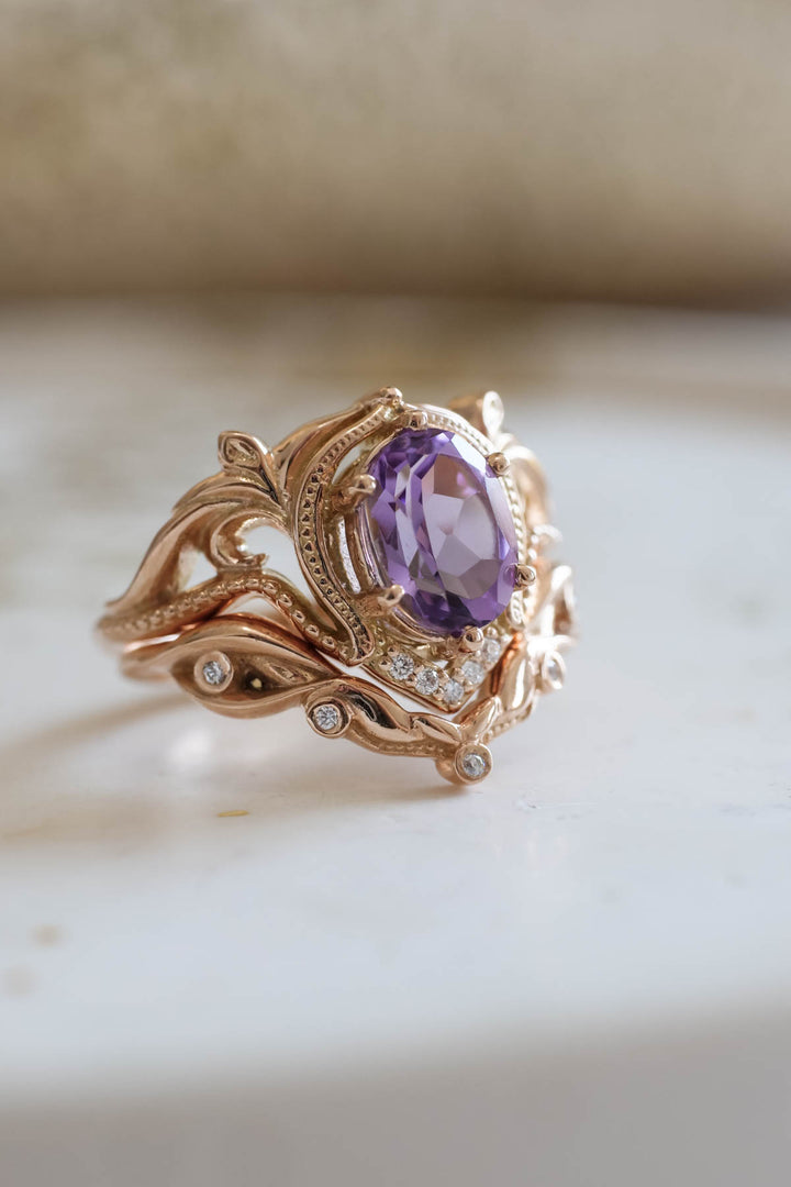 Ornate engagement ring set with amethyst, vintage inspired gold rings / Lida