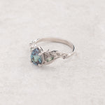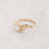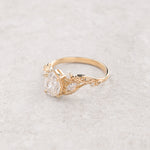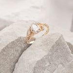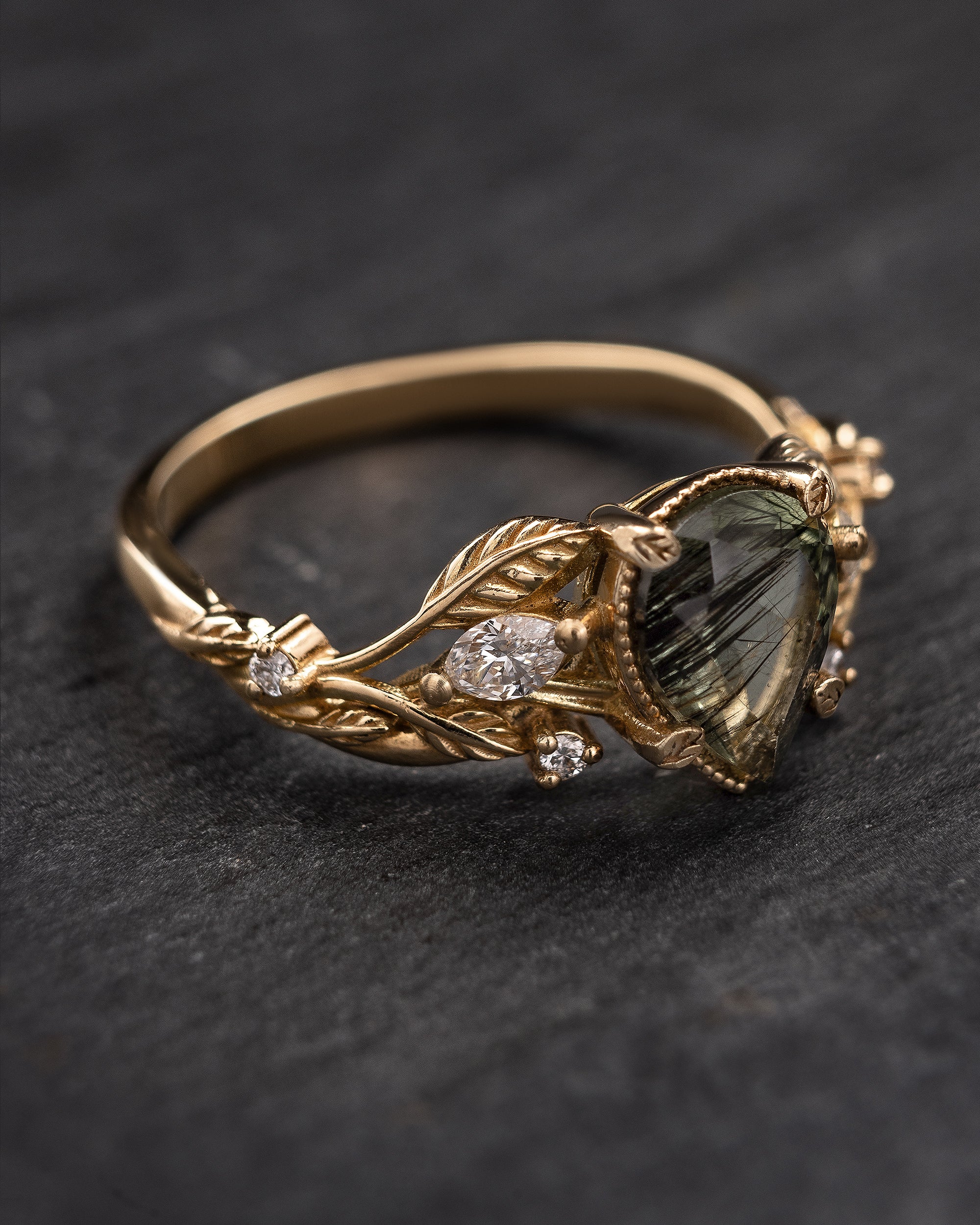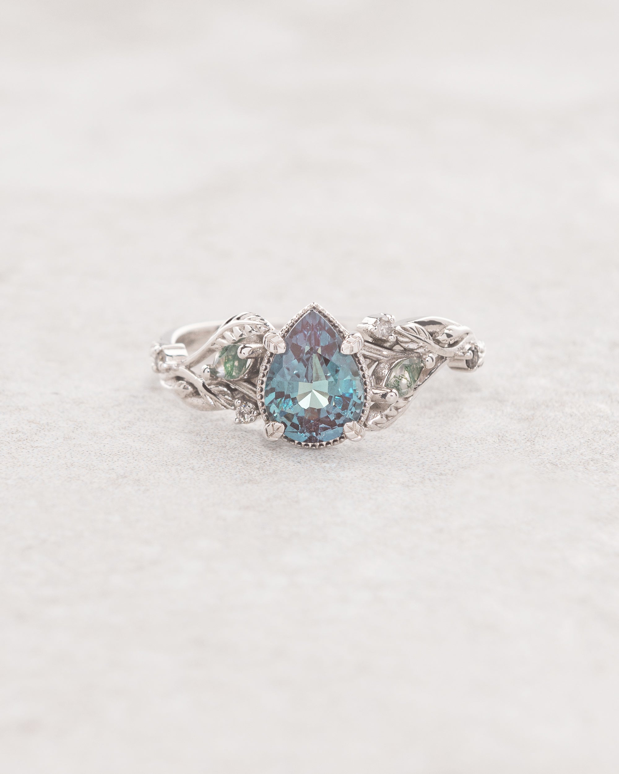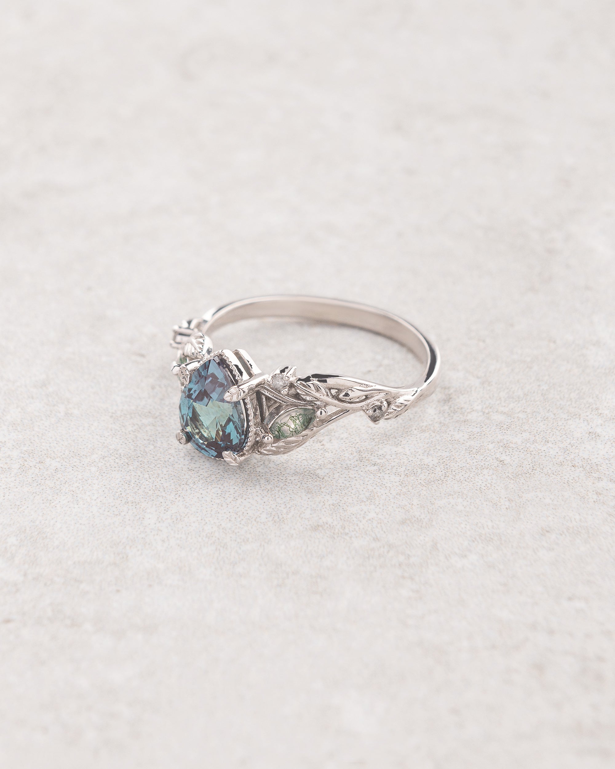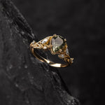 The asymmetrical Patricia ring shows an intricate design of vines and leaves that weave together in a natural way. Side gemstones are scattered between the twigs - marquise cut gemstones resemble leaf shapes and small round cuts look like shiny morning dew. The central gemstone has a beaded frame around it, adding extra detail.