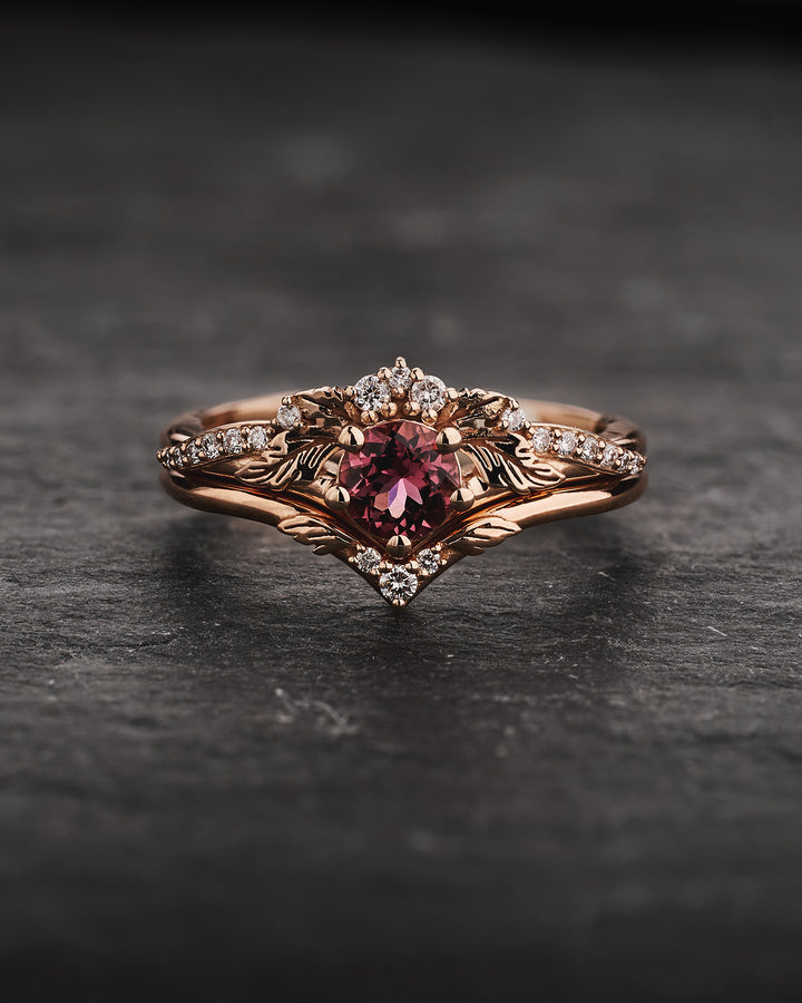 Magnificent wedding ring set features nature inspired design with a highly detailed tiny leaves. Natural tourmaline shows captivating and reach pink colour - it looks like a juicy berry. Bridal set is complimented with sparkling diamonds skilfully incorporated in naturally flowing lines.
