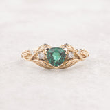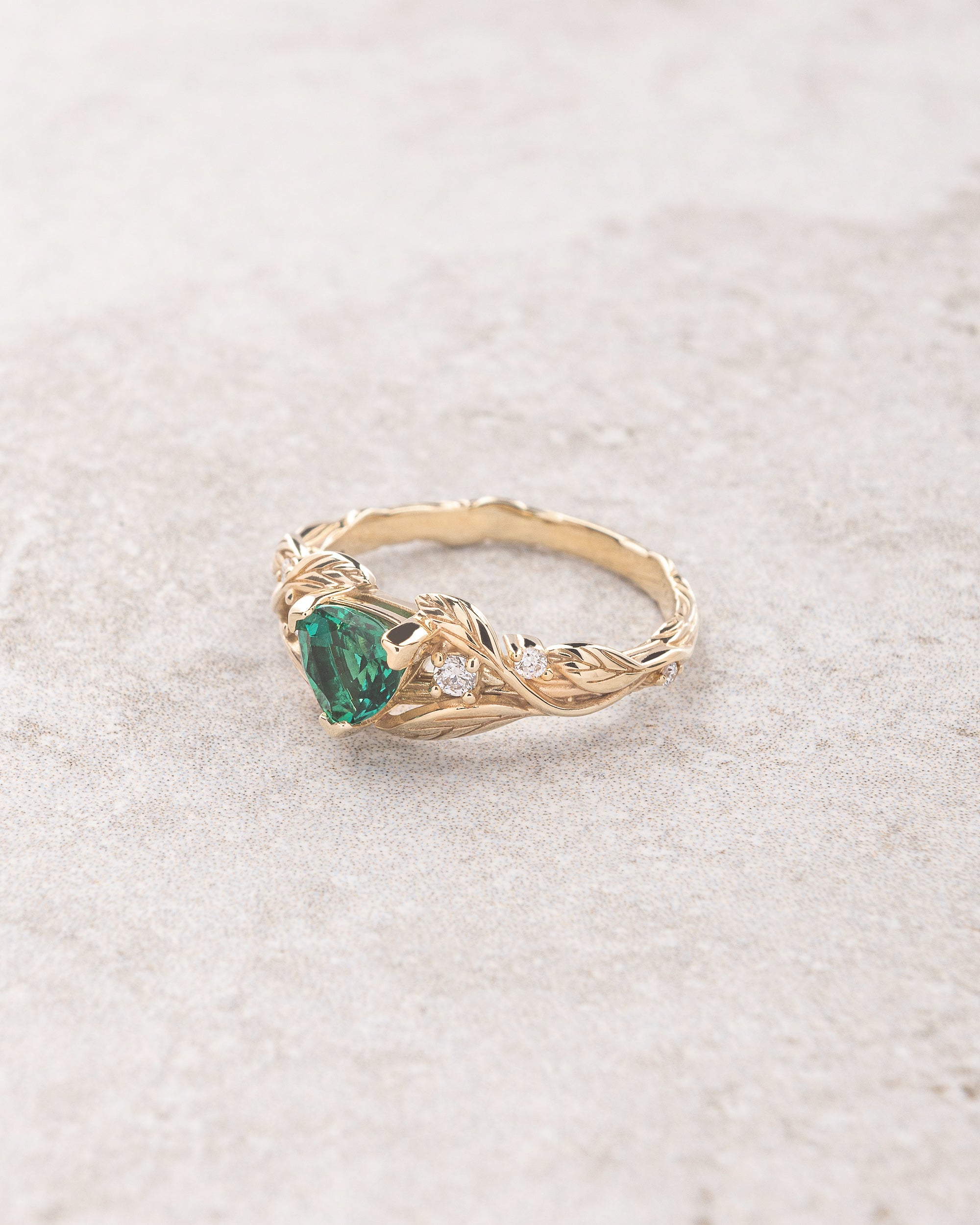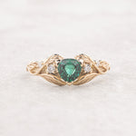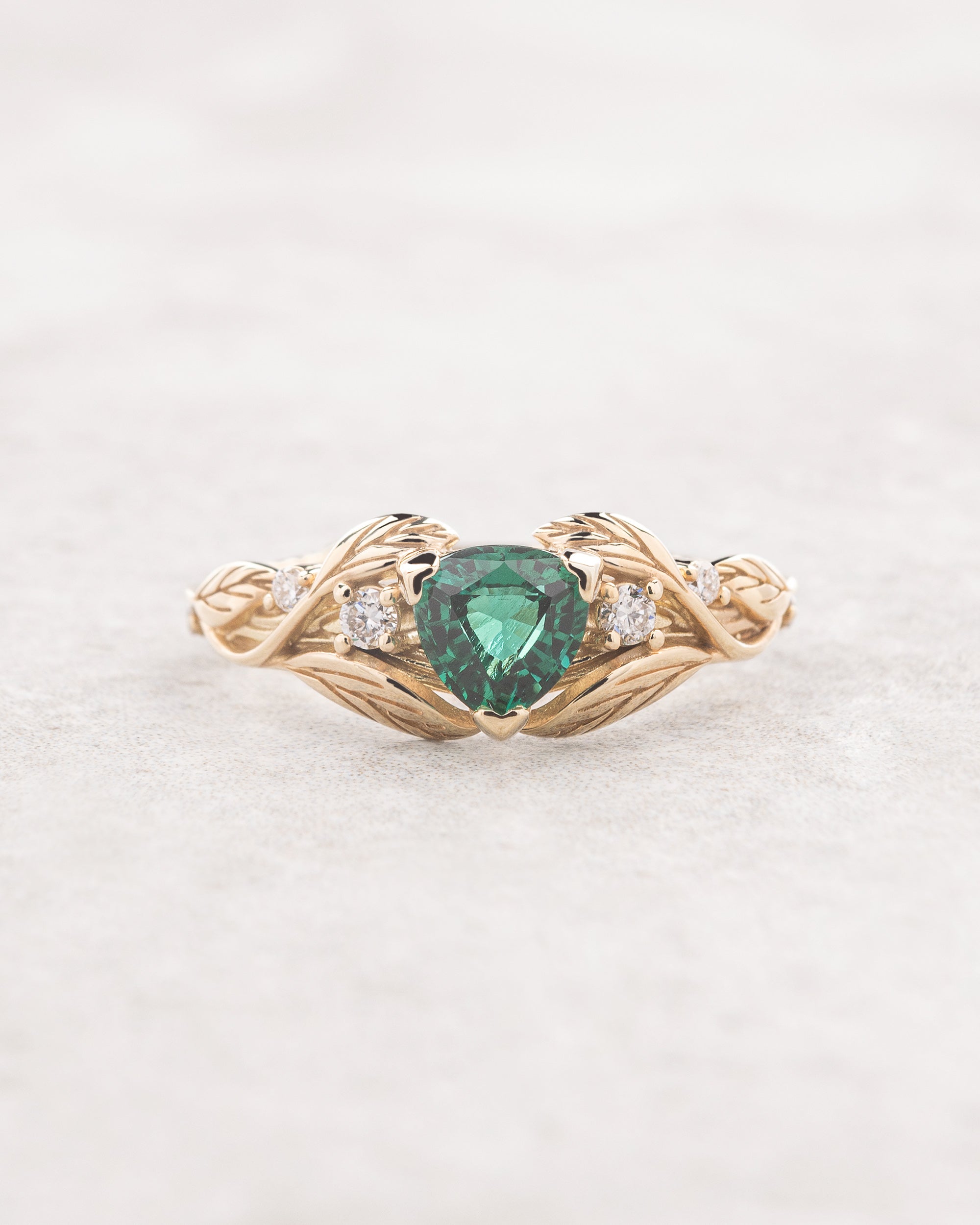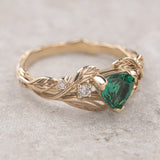 Handcrafted from solid gold this leaves band would be perfect for alternative engagement ring seekers. Trillion cut gemstone ring shows nature inspired jewelry piece with a modern twist. The Clematis engagement ring features here lab-created emerald, but can be made with other gemstones as well.