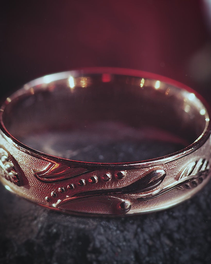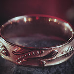 This wedding band features matching leaf design with carved elements all around the band. Nature themed wedding ring is comfortable for everyday wear.