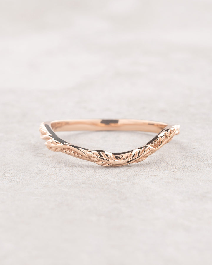 This nature wedding band is a dainty jewelry piece but sturdy enough for everyday wear. It features minimalistic leaf design with naturally curved band.